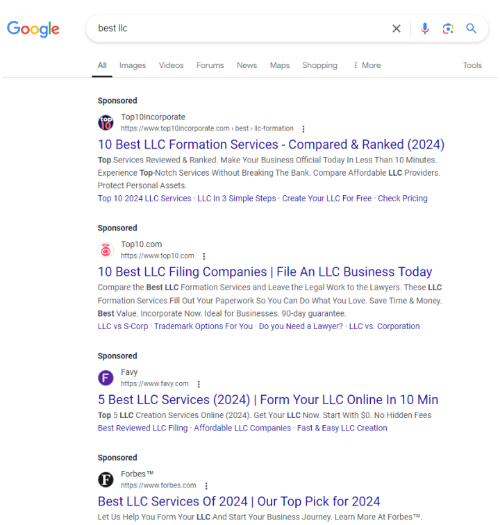 2. Highly Competitive SERPs: Competing with established players like LegalZoom, ZenBusiness, IncFile, and Top10.com.